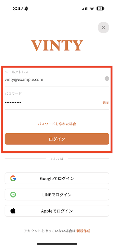 ログインの方法 ログインする手順は次の通りです。アプリを起動します。マイページから[ログイン]をタップします。登録したメールアドレスとパスワードを入力し[ログイン]をタップします。ログインができない場合メールアドレスもしくはSNSがご自身が登録したものと同一のものか確認してください。それでもログインできない場合は、お問い合わせください。