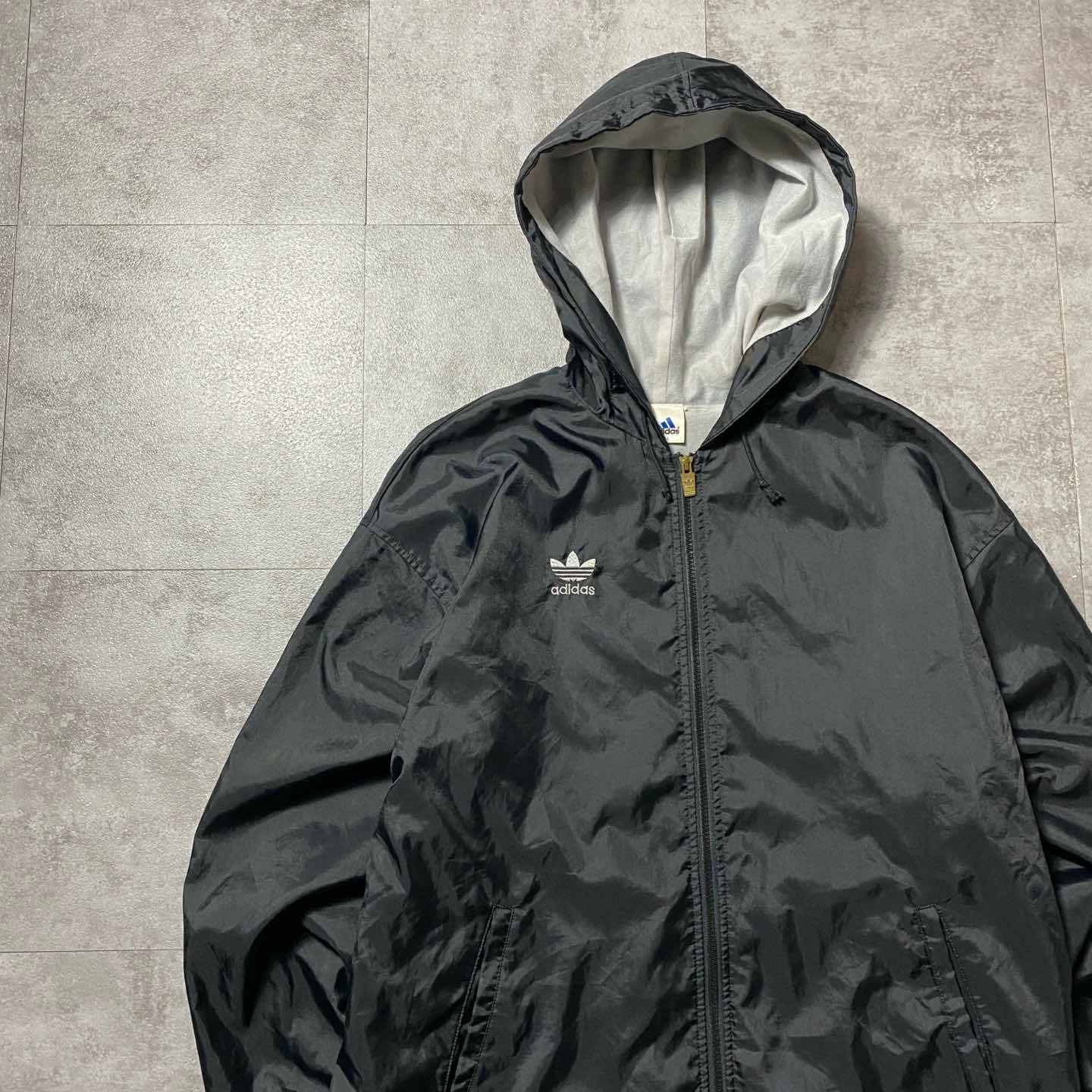 90s adidas デサント製アディダス トレフォイル 刺繍ロゴ フード ナイロンジャケット