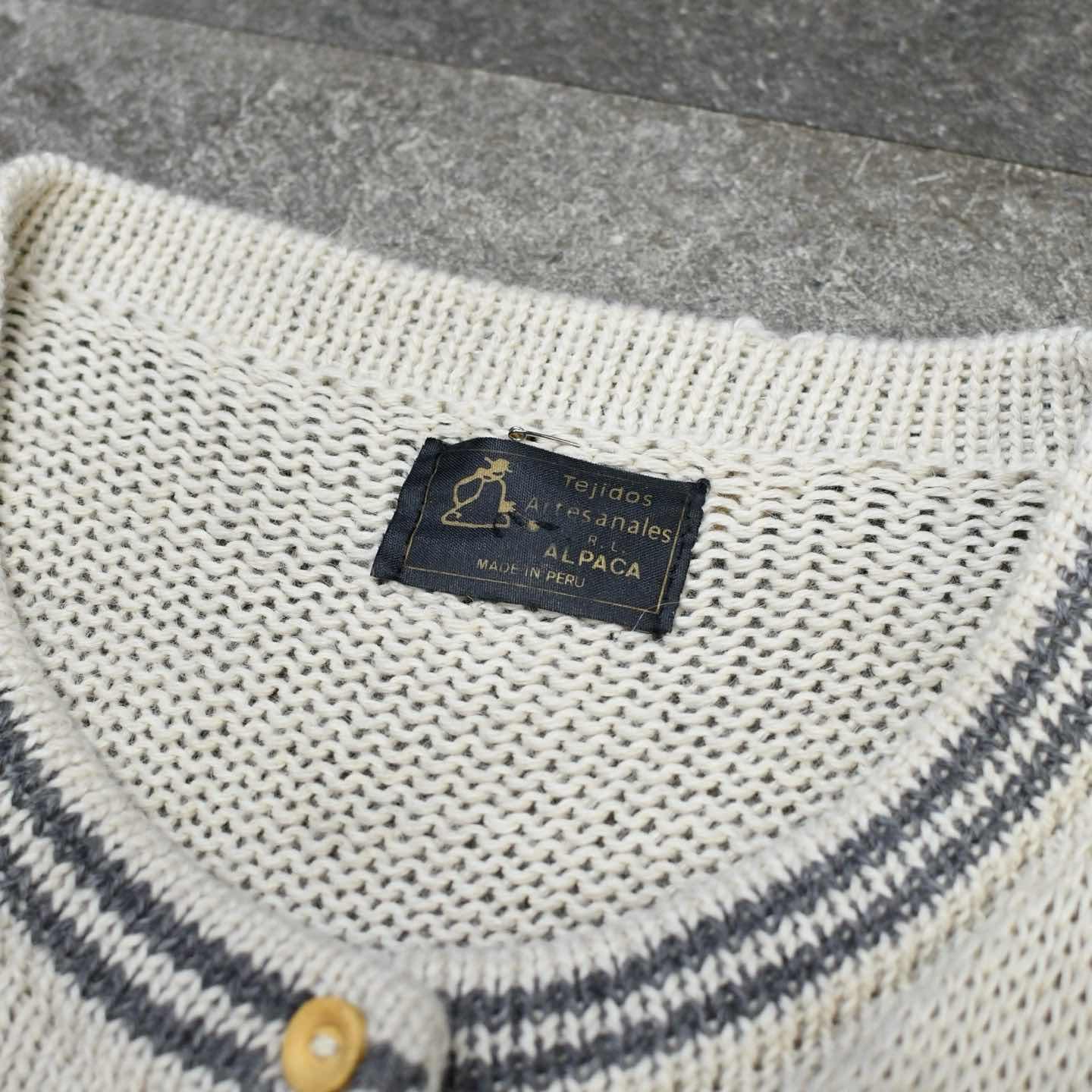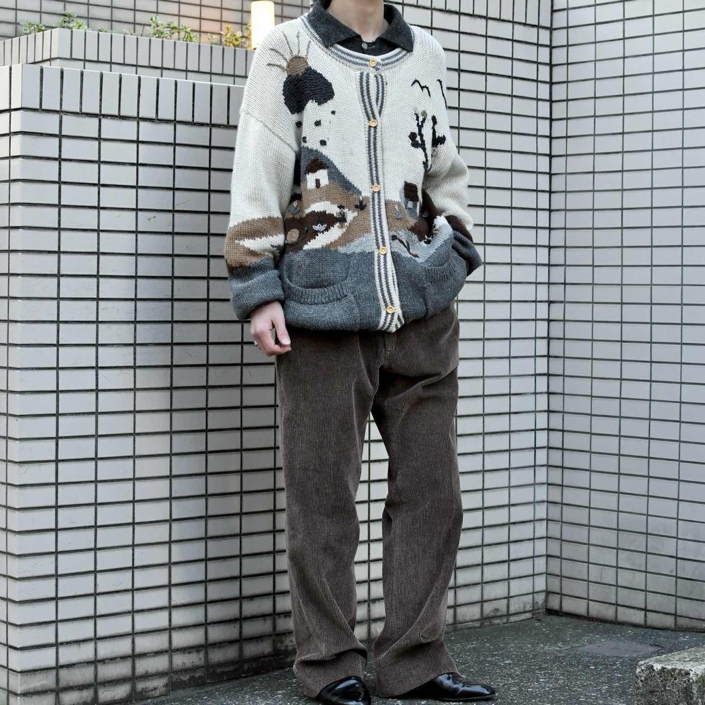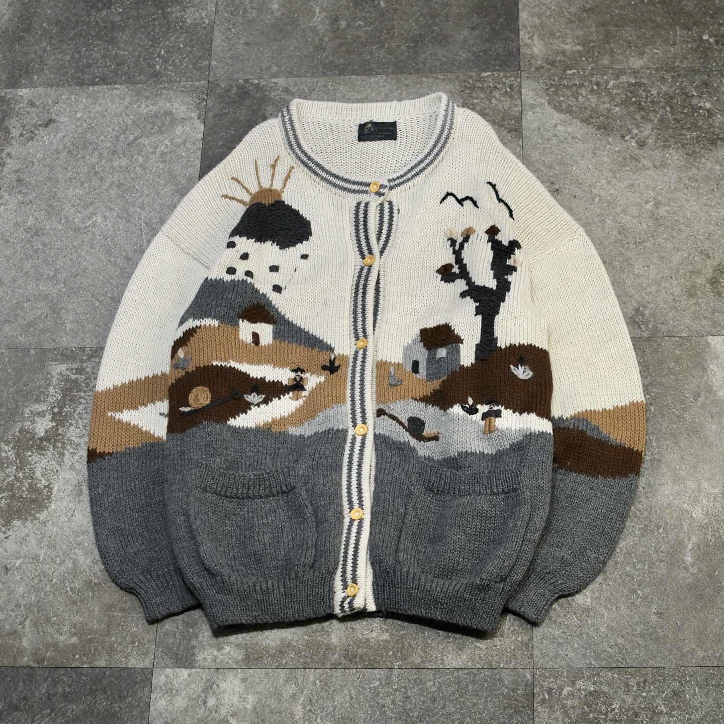 SIZE:- 着丈80cm 肩幅67cm 身幅62cm 袖丈62cm fabric/質感よりalpaca made in peru 着用画像 173cm/56kg この手の色んな意味で”温かみ”を感じるニットが 大好きです。 カラス?に太陽、そして老夫婦と巨大カタツムリ。 フルボタンだからこそニットとしてだけでなく、 カーディガンやブルゾン代わりとしても 活躍するアイテムです。 毛足の長いアルパカ素材で、ウールよりも 軽く暖かく、そして刺激が少ないのも◎ インナーにはシャツやニットポロを着て、 襟を出して、そんなスタイリングでどうぞ。 ※撮影状況により、実物と多少色が異なる場合が ございます。 ※古着を取り扱っているため、気づかない汚れや ほつれ等がある場合がございます。 ※サイズは着用感で選んでおり、 表記サイズは説明欄の最初に記載しております。 古着 オーバーサイズ old vintage ヴィンテージ used 80's 90's アメリカ古着 ユーロ古着 POLO RALPH LAUREN Eddie Bauer OLD GAP LANDS' END ランズエンド LLBean エルエルビーン オールドギャップ エディーバウアー ラルフローレン ブルックスブラザーズ Brooks Brothers アイボリー 生成り カーディガン ブルゾン などがお好きな方 #vintage #オーバーサイズ #old #used #90s #80s #古着 #ヴィンテージ #アメリカ古着 #ユーロ古着 #LLBean #エルエルビーン #EddieBauer #エディーバウアー #oldgap #オールドギャップ #LANDSEND #ランズエンド #NAUTICA #ノーティカ #ラルフローレン #POLORALPHLAUREN #アルパカニット #ニット #セーター #デザインニット #ニットブルゾン #ブルゾン #カーディガン