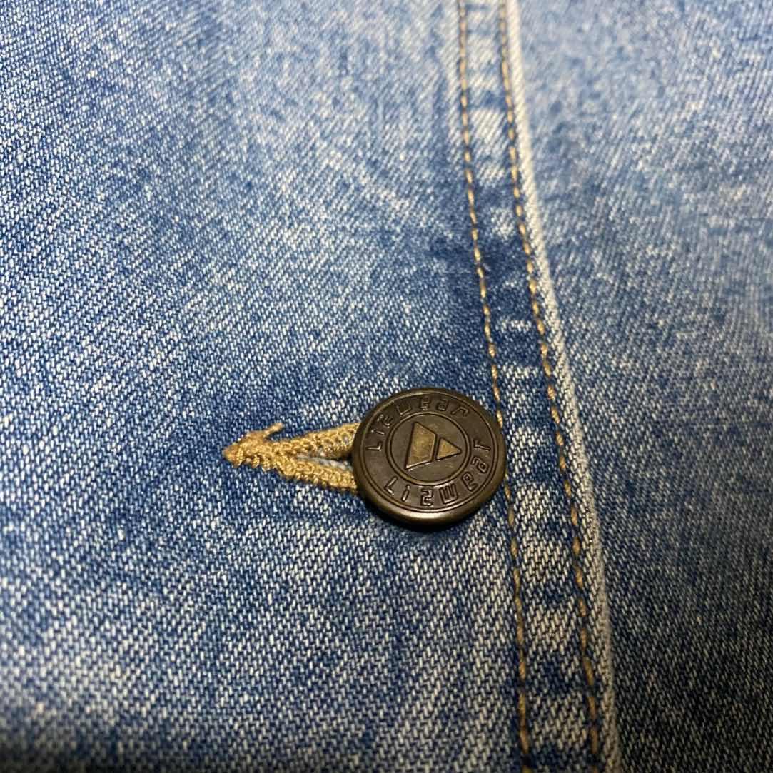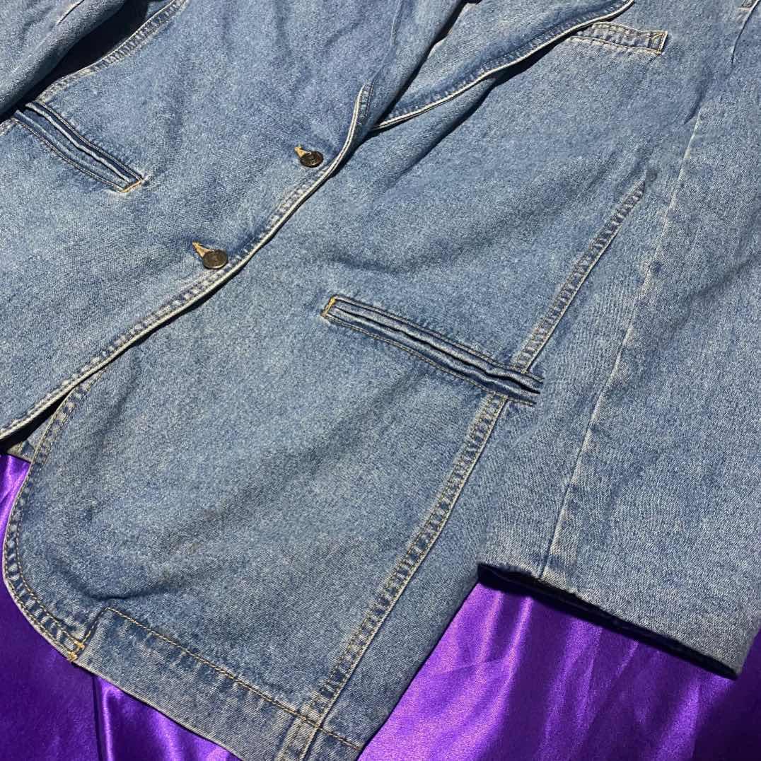 リズウェアのデニムテーラードジャケット。 リズウェアはデニムのブランドなのでデニムのアイテム多いですが幅広く展開してるのでちょっと変わったアイテムもけっこうあって面白いです。 デニムのテーラードも探すと意外と見つからないアイテムなのでデニムジャケット欲しいけど他とは差を出したいという方にオススメですね。 デニムなのに綺麗めで着れてしまうのでこれでデニムセットアップなんかもかっこいいと思います。 気になった方はお早めに。 SIZE:- 肩幅49 身幅119 袖丈61 着丈77