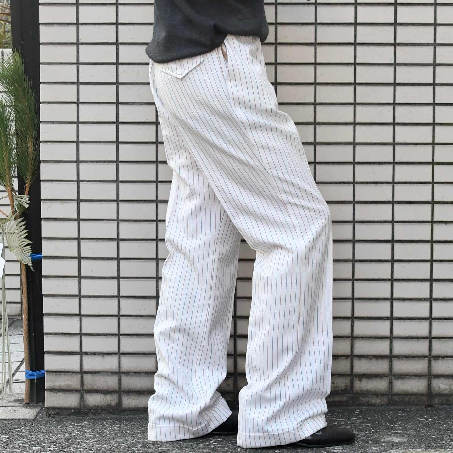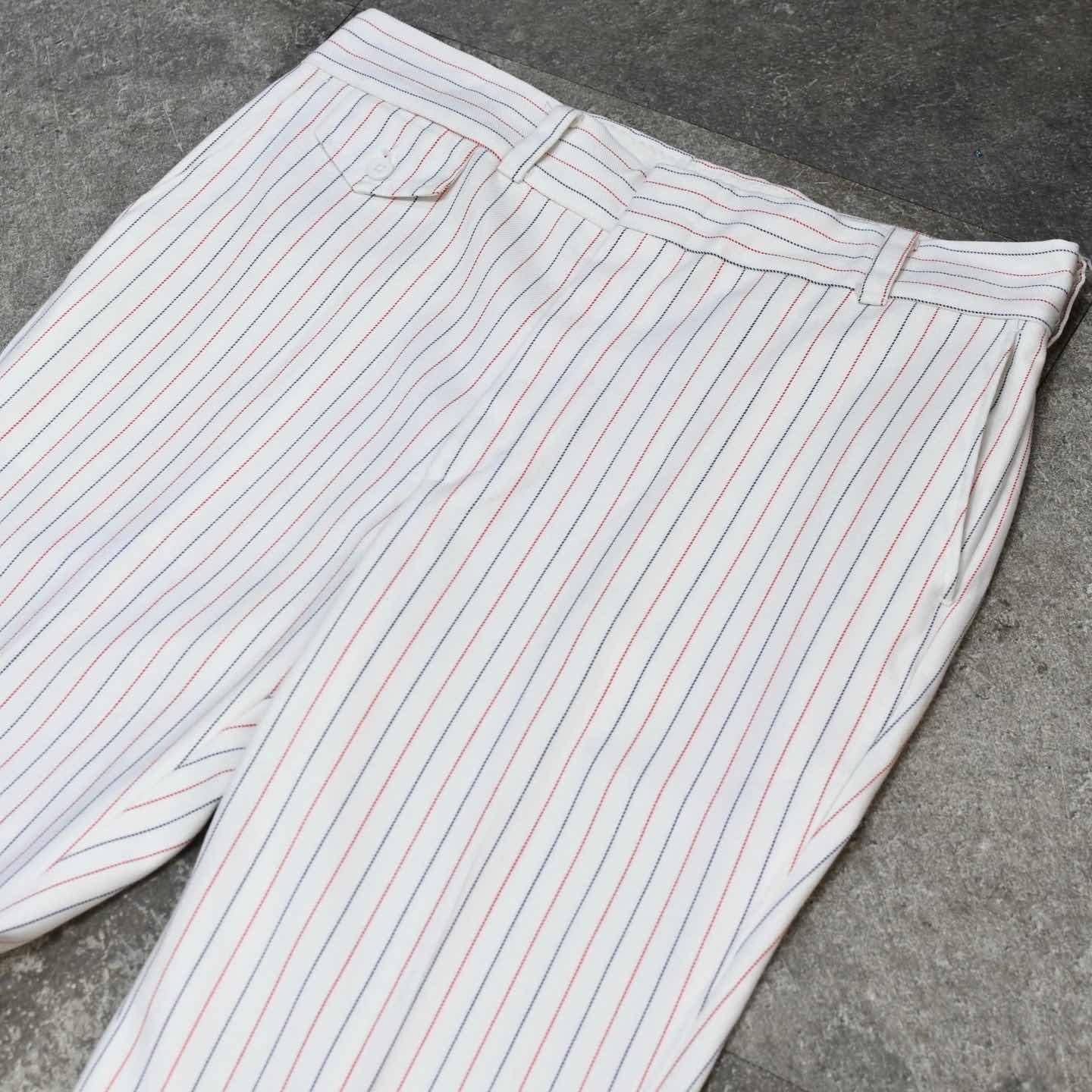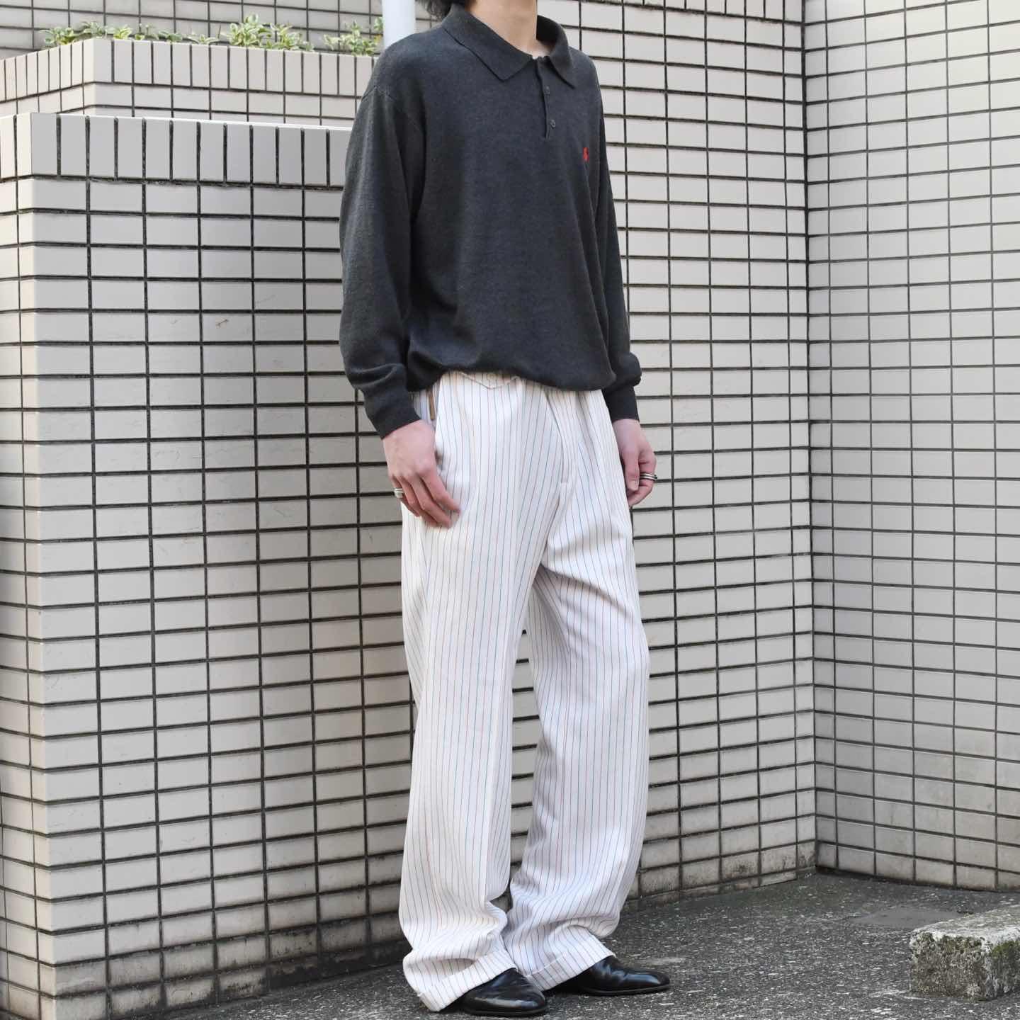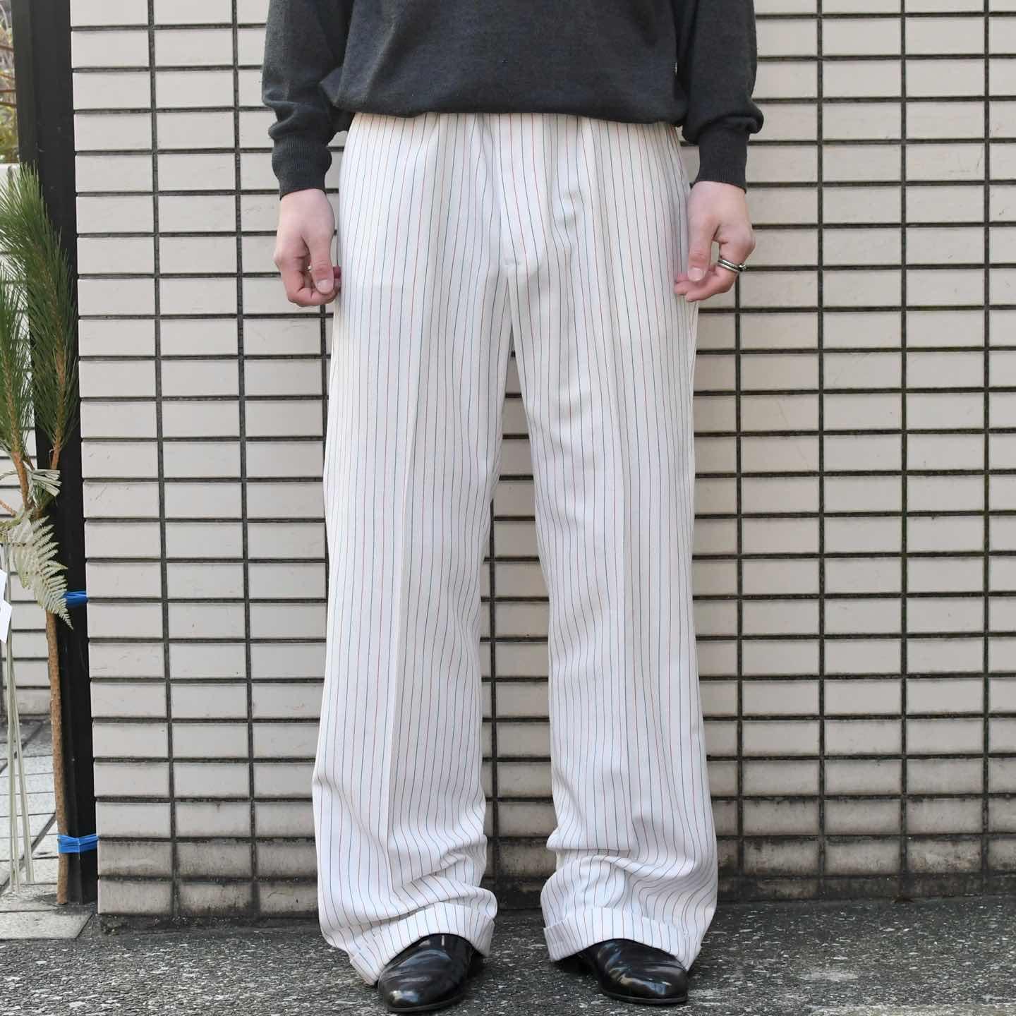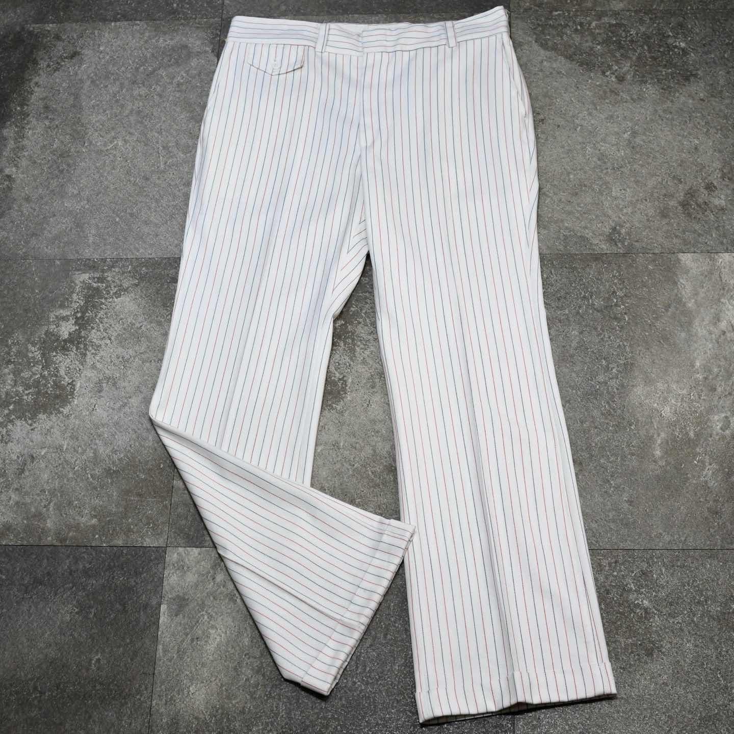 SIZE:- ウエスト88cm 総丈110cm 股下82cm わたり35.5cm 裾幅26cm fabric/質感よりwool・poly 着用画像 173cm/58kg 1970年代から80年代にかけてLevi'sで 展開されていた”PANATELA” デニム以外の生地を使用した、スラックスや スポーツウェアを中心としたラインで、 デニムをあまり穿かない自分にとって、 当ブランドで最も好きなライン。 対局する2色のピンストライプ、そして細過ぎない わたりとしっかり広がりのある裾。 キレイなシルエットでありながら、足元に溜まる 抜けのある雰囲気が◎ パンツ、スラックスの中でも癖のある一本で、 手元に数があるわけじゃないからこそ、 こんなパンツで幅を広げたいなと感じた一本です。 ※裾上げ等のレングス直しにつきましては、 購入前に、必ずご連絡お願い致します。 ※撮影状況により、実物と多少色が異なる 場合がございます。 ※古着を取り扱っているため、気づかない汚れや ほつれがある場合がございます。 ※サイズは着用感で選んでおり、 表記サイズは説明欄の最初に記載しております。 古着 オーバーサイズ old vintage ヴィンテージ used 80's 90's アメリカ古着 ユーロ古着 POLO RALPH LAUREN Eddie Bauer OLD GAP LANDS' END ランズエンド LLBean エルエルビーン オールドギャップ エディーバウアー ラルフローレン ブルックスブラザーズ Brooks Brothers 白 ストライプ ブーツカット リーバイス フレアスラックス などがお好きな方 #vintage #オーバーサイズ #old #used #90s #80s #古着 #ヴィンテージ #ラルフローレン #POLORALPHLAUREN #ブルックスブラザーズ #BrooksBrothers #LEVIS #フレアパンツ #スラックス