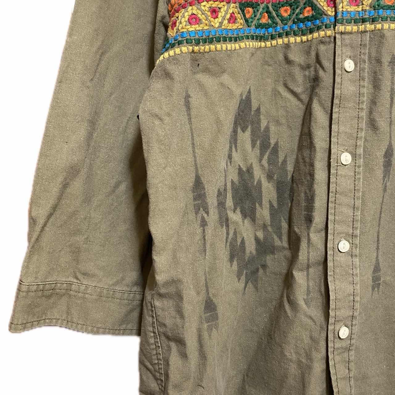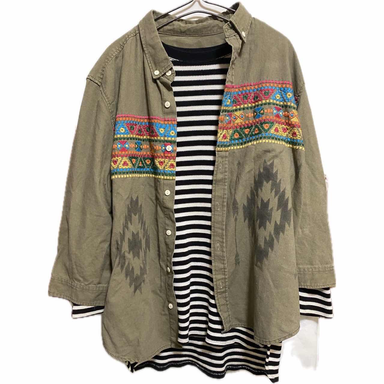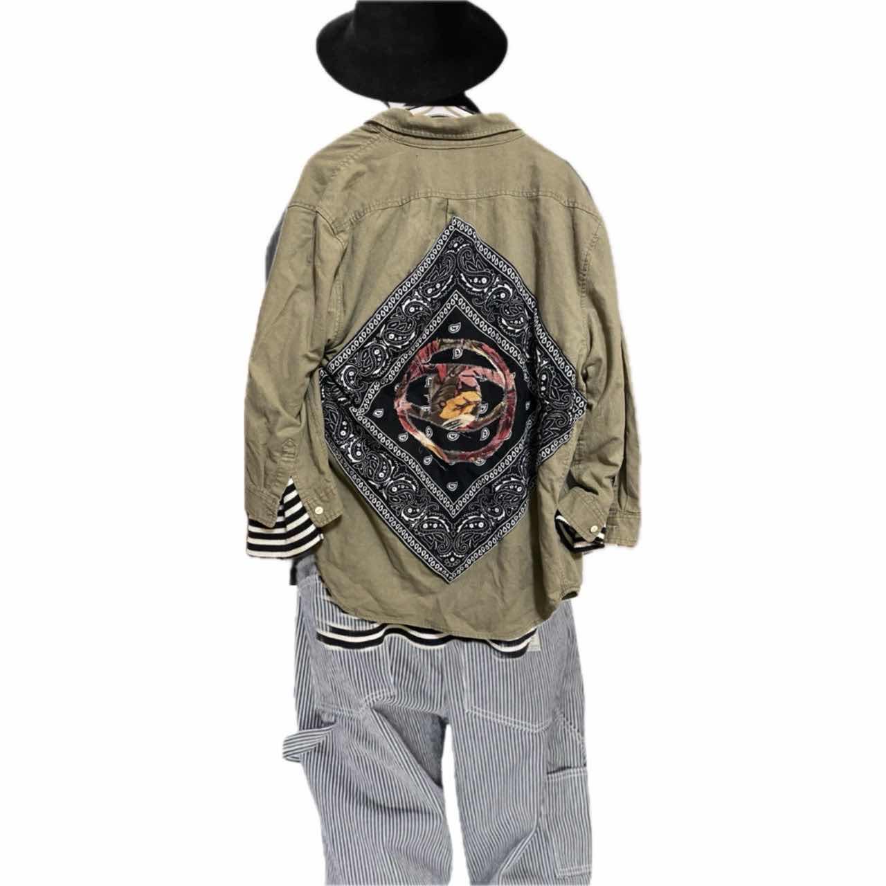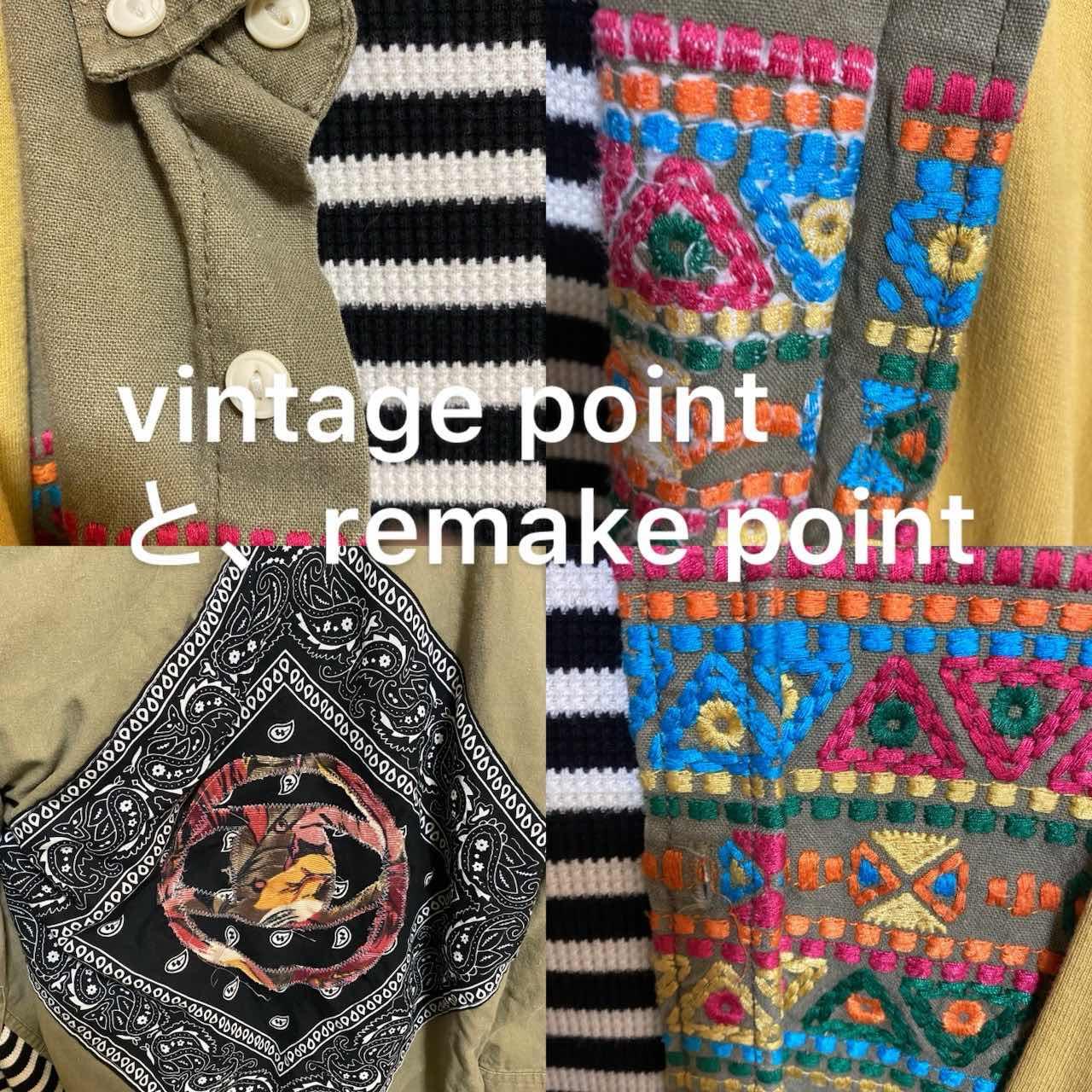 70s R.B.U シャツ リメイク猫目ボタン オルテガ 刺繍 R.B.U先ずこの希少価値を説明します。 R real B battle U uniform の、意味、軍が、本格的な、戦闘のさい 使うシャツ、vintagepointと、リメイクpointは、写真に載せてますが、 まず、リストスリーブなのも理由が、あります、戦闘の際Lスリーブだと、ひっかかりが、出る場合あるから、さらに、チンストでほこりある、だらしなさなく、BD.これも前項と一緒、で、猫目ボタン 70sミリタリーにおおい、これは、着脱素早くできるから、 です、 機能は、パーフェクト、なら、 もっとカジュアルにたのしめるかな?とリメイクしました^_^ オルテガプリント 遊牧先住民刺繍※これが、一番手間かかりました^_^ バック バンダナ縫い付けて、フリーメイソンアート作り縫い付けてます。 コーデご覧下さい、ヒッコリーペインター 【アメカジOK】 サイドラインボトム【ニードルズ、コーデ】スポーツmix 気温差対応【キレイ目アメカジ】 カーディガン羽織りと、マルチな、一着に仕上げてます、 お気に召しましたらご購入よろしくお願いします ▷カラー◁ 写真通り ▷size◁ 平置き片面採寸【㎝表記】 表記size Lを使用しました、 着丈75 身幅57 膚幅50 袖丈59 シルエット、襟で完全70sですね、 DSは袖はハンガー採寸 ※多少の誤差は理解下さい 170センチ Mジャストの私が、着用してゆったりです、インナーXL着てます参考に 【素材】 コットン 【状態】 最高級、丁寧にリメイクしたんで、 検品、洗濯、検品で、3回チェックして発送しますので、ご安心して、お買い求め下さい!!