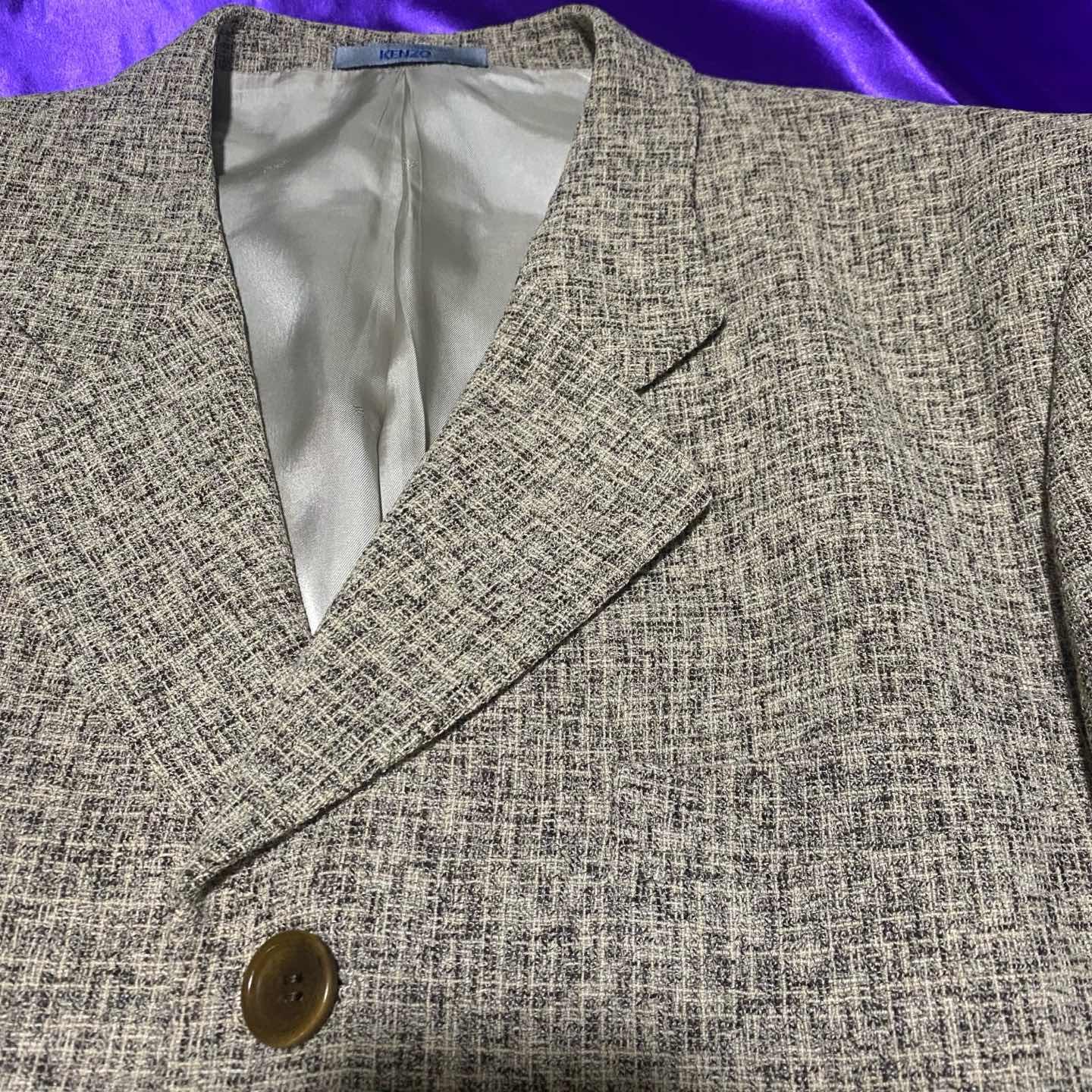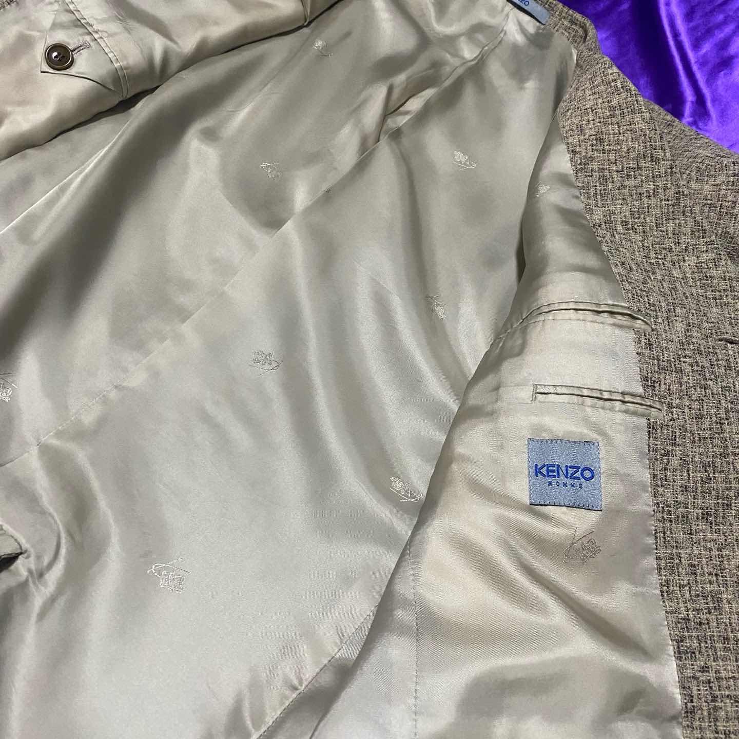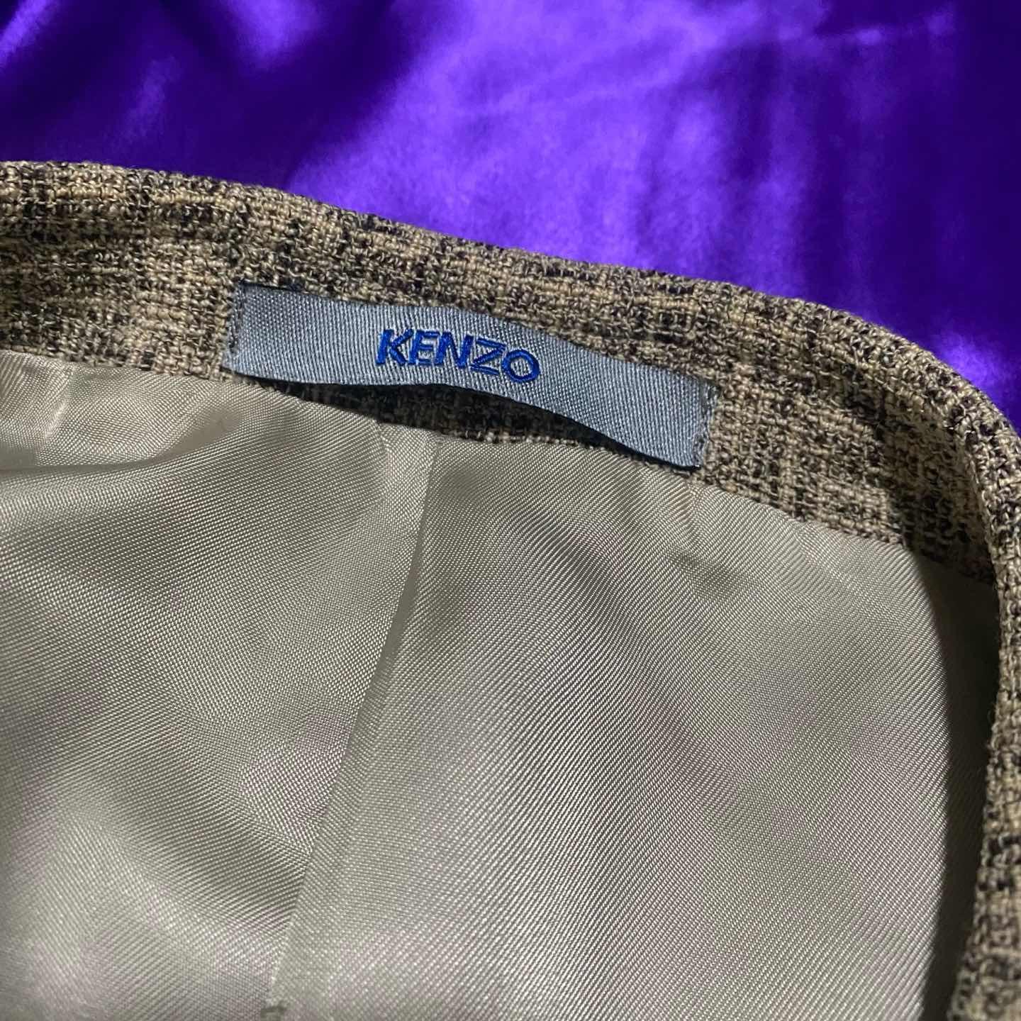 KENZOの総柄テーラードジャケット。 KENZOはうちのお店では初登場ですね。 簡単に紹介すると1970年に日本人のKenzo Takadaが作ったラグジュアリーブランドでフランスで創業しました。 虎のロゴが有名ですね。 今ではカジュアルよりのアイテムが多いですが古着で探してみるとこのアイテムのようにテーラードジャケットや綺麗めアイテムもけっこうあり柄が可愛いものも多いのでオススメです。 このアイテムは3つボタンがあり着丈も少し長めなのでコートのような感覚でも着ることができます。 サイズ十分なのでジャケット重ねとかしてみても面白いですよ。 気になった方はお早めに。 SIZE:3 肩幅51 身幅114 袖丈62 着丈79.5