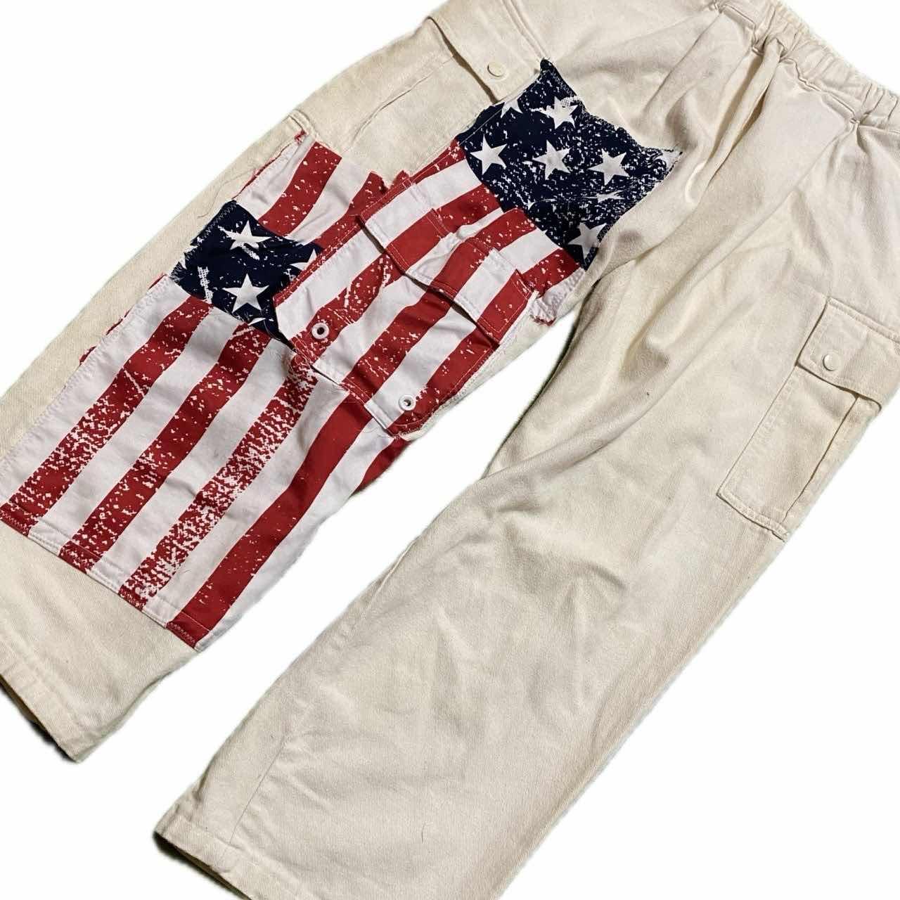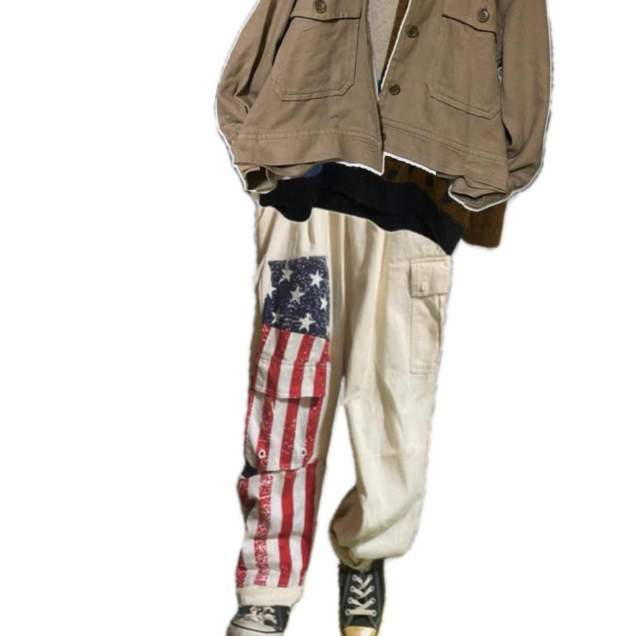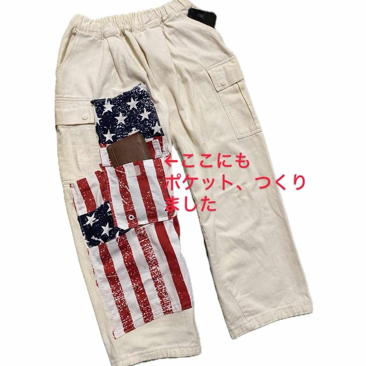 W66-90対応90s remke 星条旗多機能bottom 90s カジュアルにシルエットのいいボトムを、もっとカッコよくしたくて、、、 星条旗縫い付けました、写真みていただけますと幸いですが、デザインの中に、かくされた、ポケットや、サイドポケットなど、多機能かつ、マルチにかつやく、さらに、コーデも、様々なアイテムと、気回すことができますので、 アメリカの国旗を。みせつけて、お洒落を、自由に楽しんで下さい^_^、 ▷size◁ 平置き片面採寸【㎝表記】 表記size 【※ウエストのみ、メジャーで一周採寸】 ウエスト66-90対応Lとしときます 股上33 股下64 股下短いと勘違いする方へ、股上深いだけですよ、理由ハイウエストも決めれるようです、 腿渡り幅30 裾幅23 モデル170㎝/普通体型、30インチジャストな体型参考に、 ▷material◁ バイアスcotton ▷condition◁ カッコ良くしあげて、最高です^_^ ※入念にチェックは、しておりますが、vintage/usedの特性ご理解下さい
